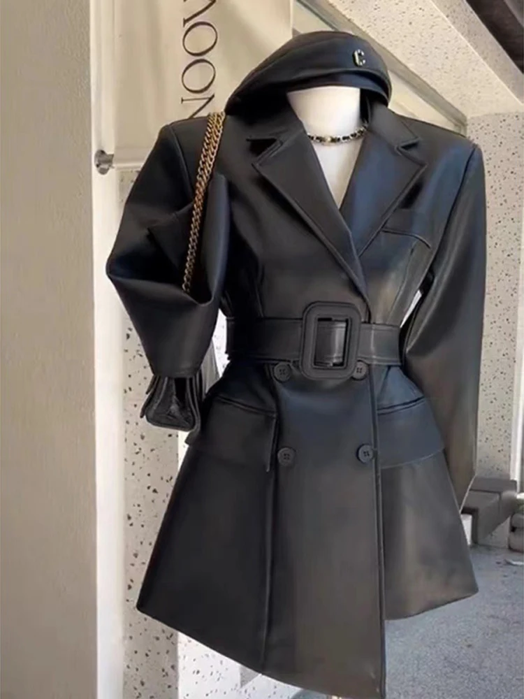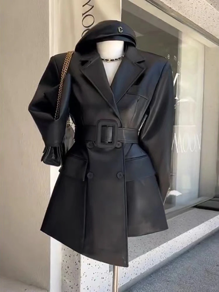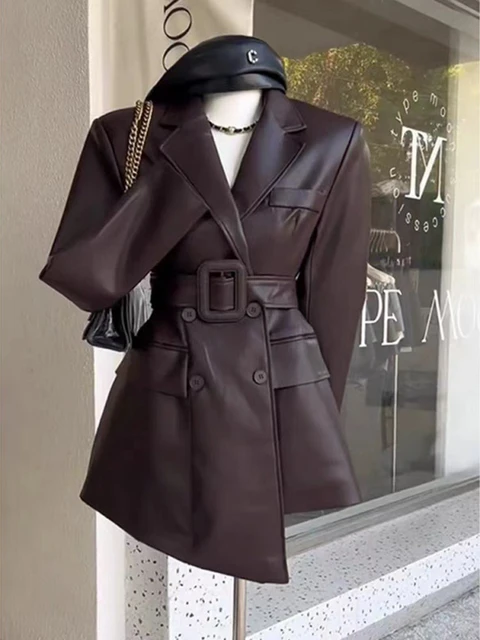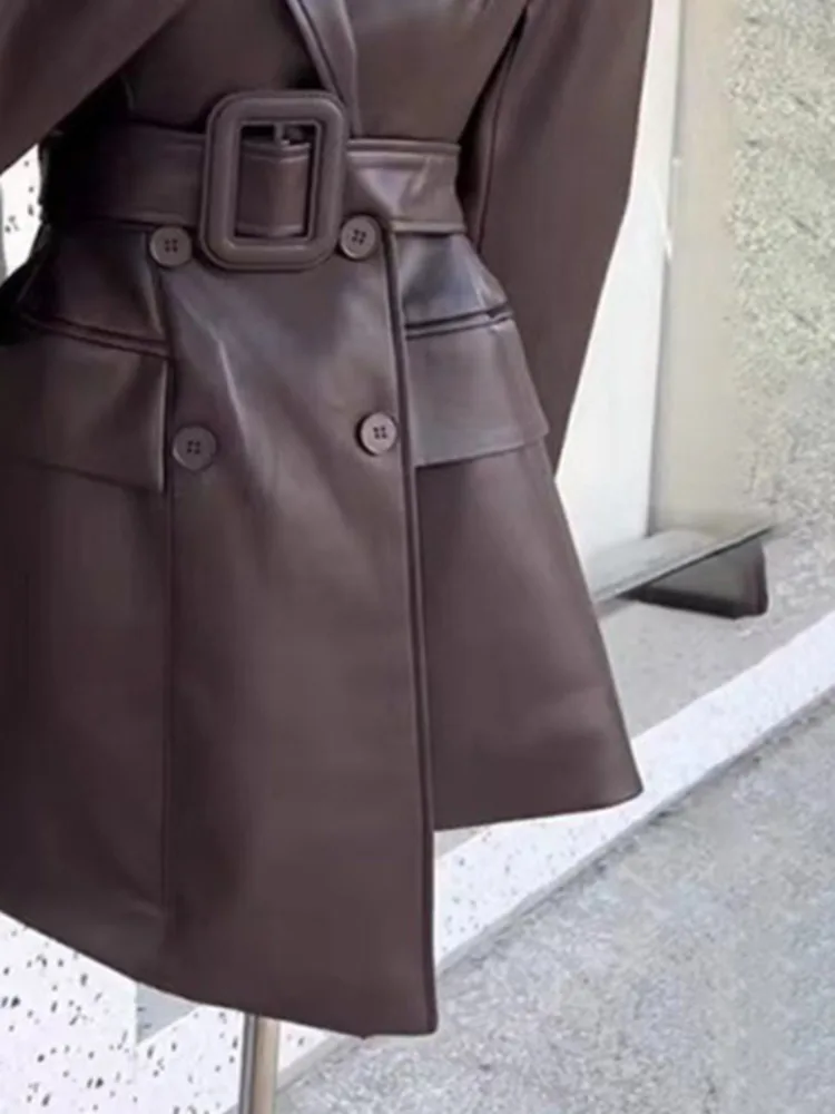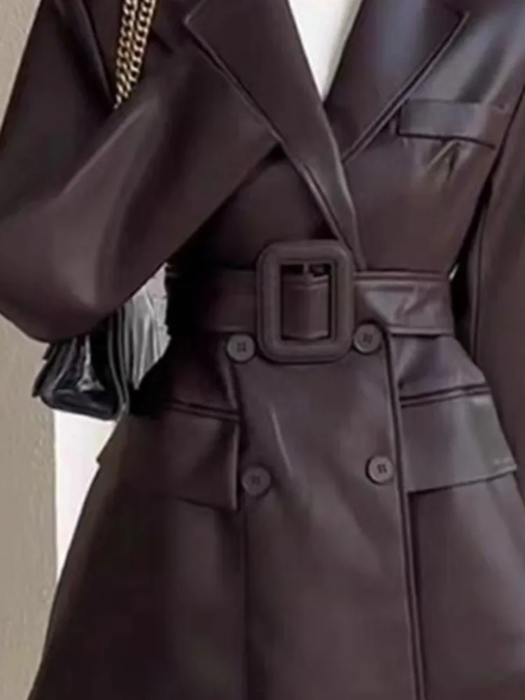 Coffee PU Leather Jacket For Women Long Sleeve Hem Asymmetric With Belt Office Lady Coat